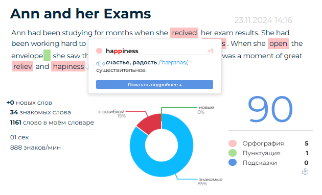 - Мгновенная обратная связь: получайте автоматические результаты написания и статистику по диктанту для корректировки плана обучения.