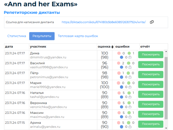 Ученики могут написать онлайн-диктант в любое удобное время. Результат сохранится у них в профиле и в кабинете репетитора.