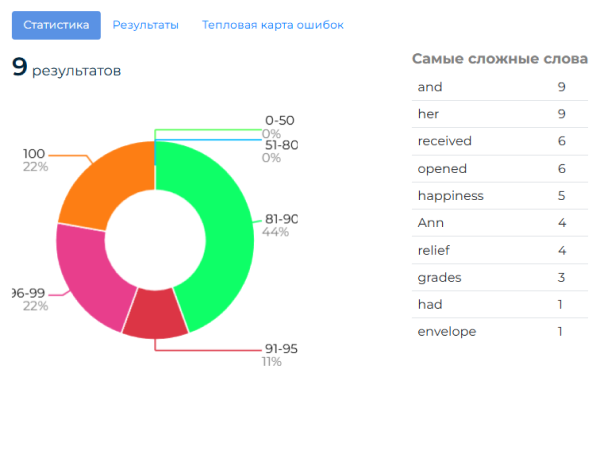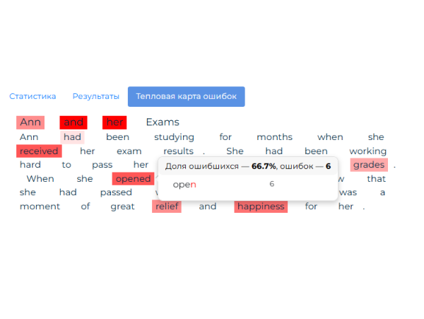 - тепловая карта ошибок диктанта со статистикой по каждому слову.
